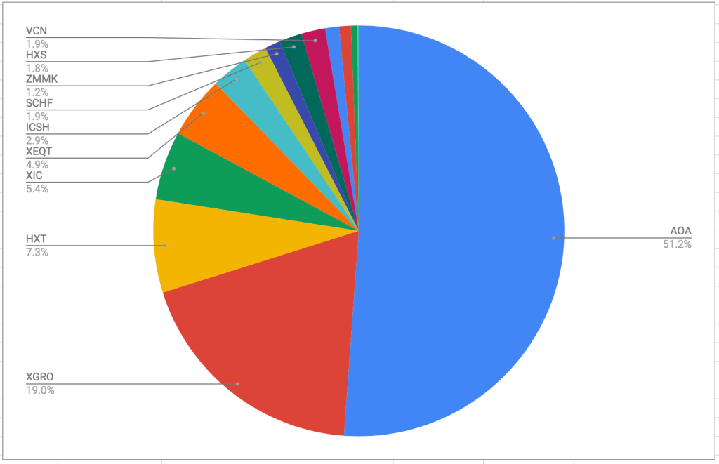 The portfolio, as always, is dominated by AOA and XGRO which are 80/20 asset allocation funds in USD and CAD, respectively. The rest are primarily either cash-like holdings in two ETFs: ZMMK in CAD and ICSH in USD) or residual ETFs held in non-registered accounts for which I don’t want to create unnecessary capital gains just for the sake of holding AOA or XGRO.