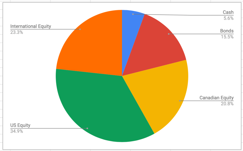 • 20% Canadian equity (mostly based on ETFs that mirror the S&P/TSX 60)