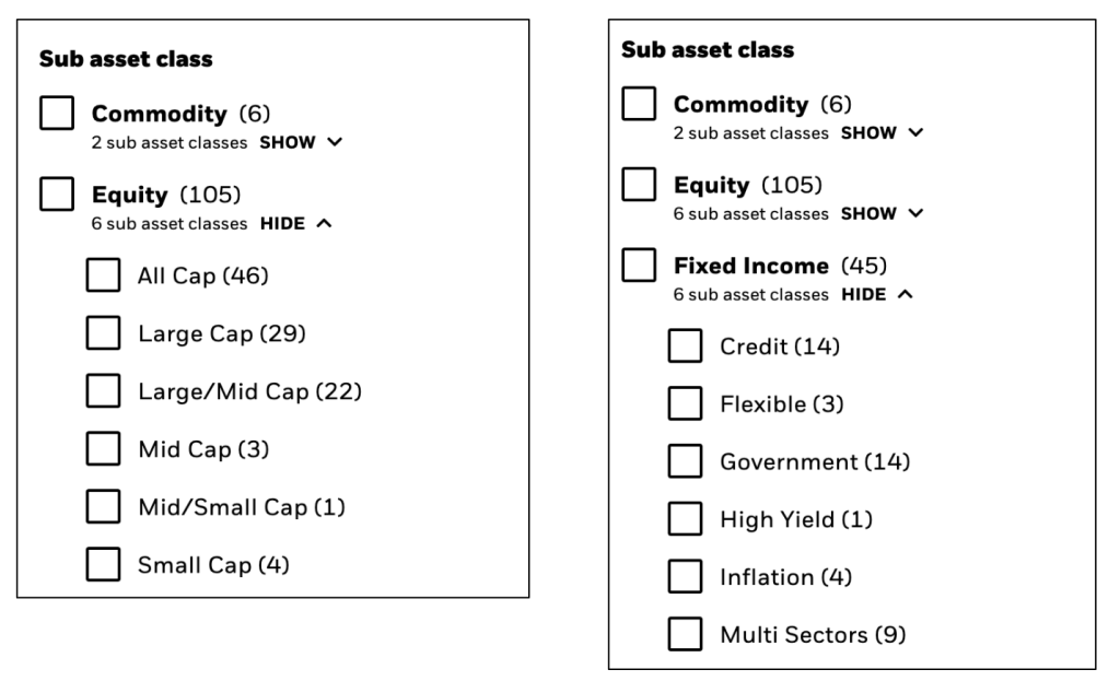 …and now you can quickly recognize “Equity” (with 105 different ETFs to choose from). “Fixed Income” is the other term of interest — this will include bonds and probably something that looks more like cash. So this is now looking a little more sane. Wait, what’s this? They each have “sub classes”?
