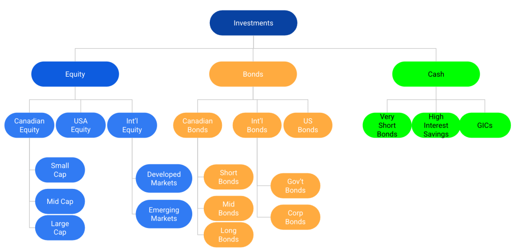 - Equity: divided into 3 buckets for Canadian, US and International Equity