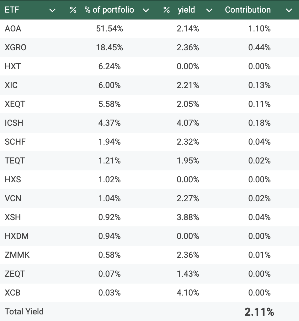 So, using the ETF fact sheets1 and my current holdings, I give you the overall yield2 of my retirement portfolio: