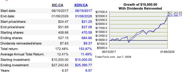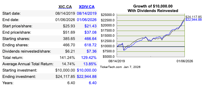 What if I instead chose to compare the Canadian portion of XEQT to XDIV? (I broke down what’s inside these all-in-ones in a previous article: Under the hood of XEQT et al). XEQT’s Canadian portion is XIC, an ETF that tracks the entire TSX (219 stocks), so let’s run the numbers again over the same time period: