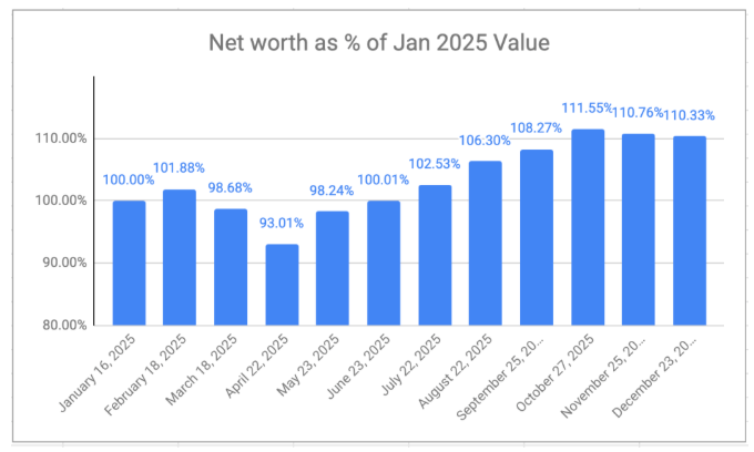 Now of course, you could find counter examples I suppose. But if capital preservation isn’t a concern6, then these results tell me that dividends needn’t be a concern in retirement. Even with my anemic yield stats, my net worth increased in 2025 even accounting for getting paid every month (chart from my latest What’s in My Retirement Portfolio):