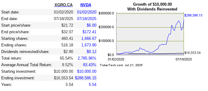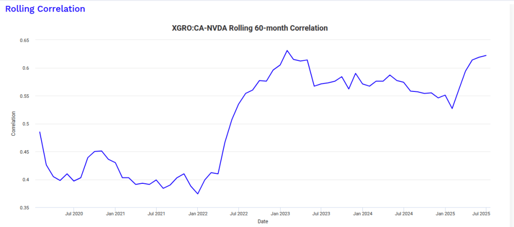 One nagging concern I’ve heard about index investing1 is that you can end up overly concentrated in a handful of stocks. For example, as of today, per XGRO’s fact sheet, for every $100 I have invested in XGRO, I’m actually investing almost $5 between two companies, NVIDIA and Microsoft. And for every $100 I have invested in AOA, it’s $7 in these two companies. Although that sounds like it might be a significant concentration, I found a way to test the correlation using https://www.portfoliovisualizer.com/asset-correlations. As you can see, XGRO and NVIDIA are not terribly well-correlated: