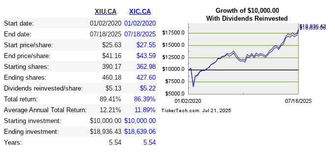 XIC holds a lot more companies, and in addition to capping any single company, this has the effect of shifting the emphasis to smaller companies. So does this make a big difference in performance? Let’s check using this calculator.