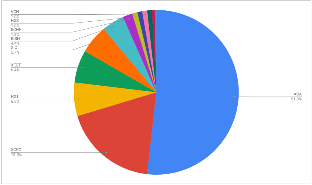 - 15% bonds (almost all are buried in XGRO and AOA)