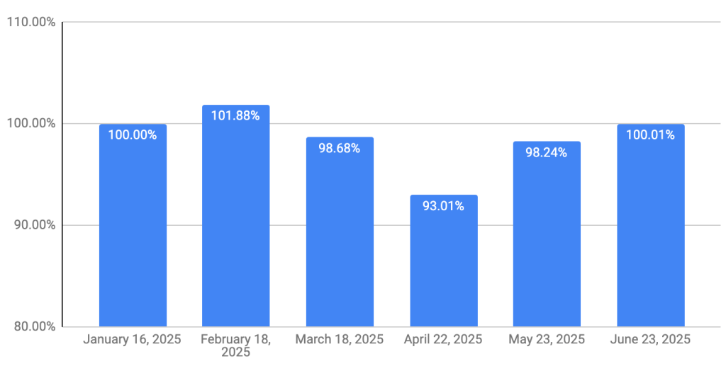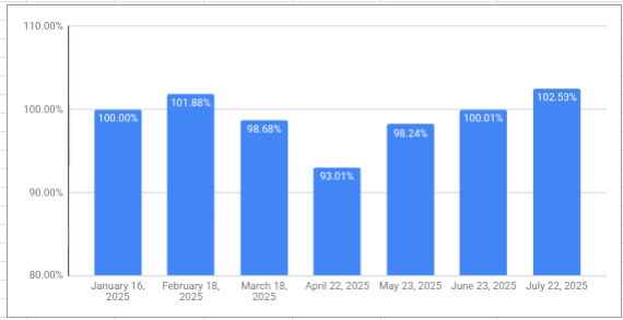 My VPW-calculated salary has hit a new high this year, 4.22% higher than my first draw in January1. This is also expected, since it tracks the value of the retirement portfolio, albeit in a much more controlled way. The VPW “cash cushion” smooths out the ups and downs of the monthly returns. I suppose I really should see an increase in my salary on par with inflation so that I maintain my spending power. I’ll have to think about how to track that2.