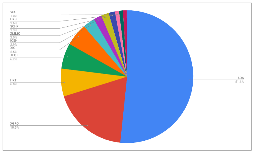 - 15% bonds (almost all are buried in XGRO and AOA)
