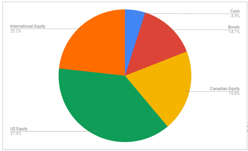 - 20% Canadian equity (mostly based on ETFs that mirror the S&P/TSX 60)